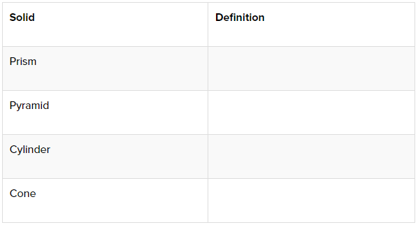 Finally, ask students to develop definitions for the different solids shown in the chart below.