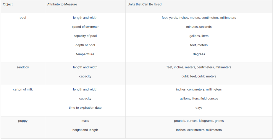 H: Present pictures of several common iems, identify what attributes can be measured for each item, such as length, width, height, volume, and area, using appropriate units of measurement.