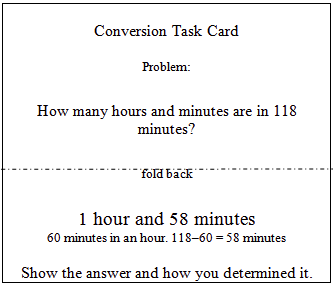 Students can then explore various forms of conversions, such as minutes to hours, and design challenges for their classmates to solve. Students can record their problems on a Conversion Task Card (M-4-1-1_Conversion Task Card). After exchanging with a partner for immediate feedback, students can check their work by folding back the answer.