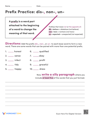 Master prefixes with our practice worksheet! Focus on dis-, non-, and un- to expand vocabulary. Download now for enhanced learning!